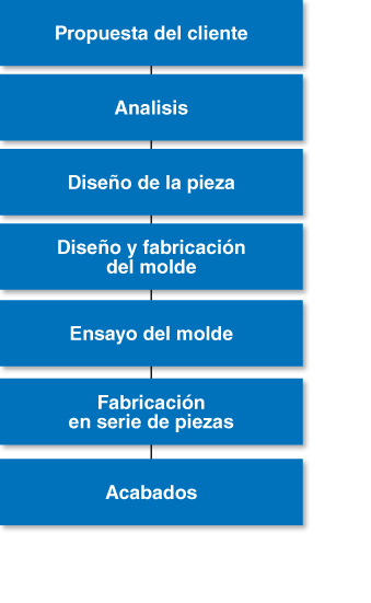 El proyecto empieza con un análisis de la propuesta conceptual del cliente y sigue con el diseño de planos y prototipos 3D, hasta la elección de materiales, la fabricación y ensayo del molde, la fabricación del producto y sus acabados.